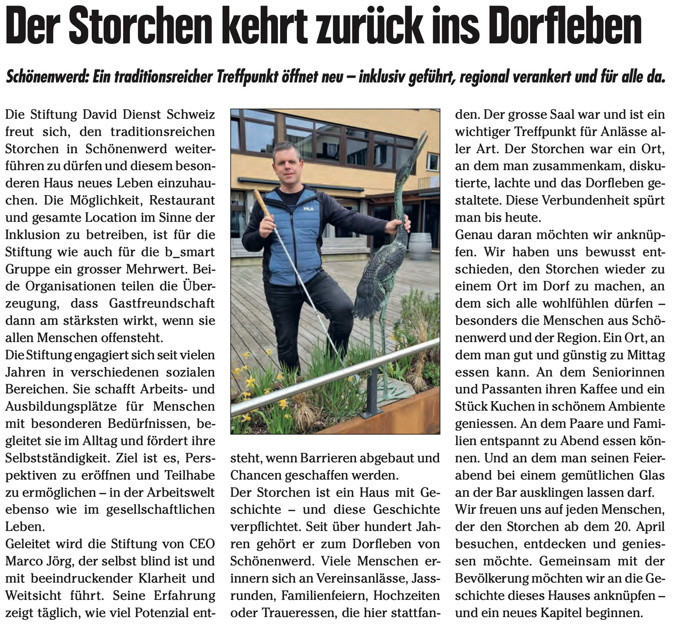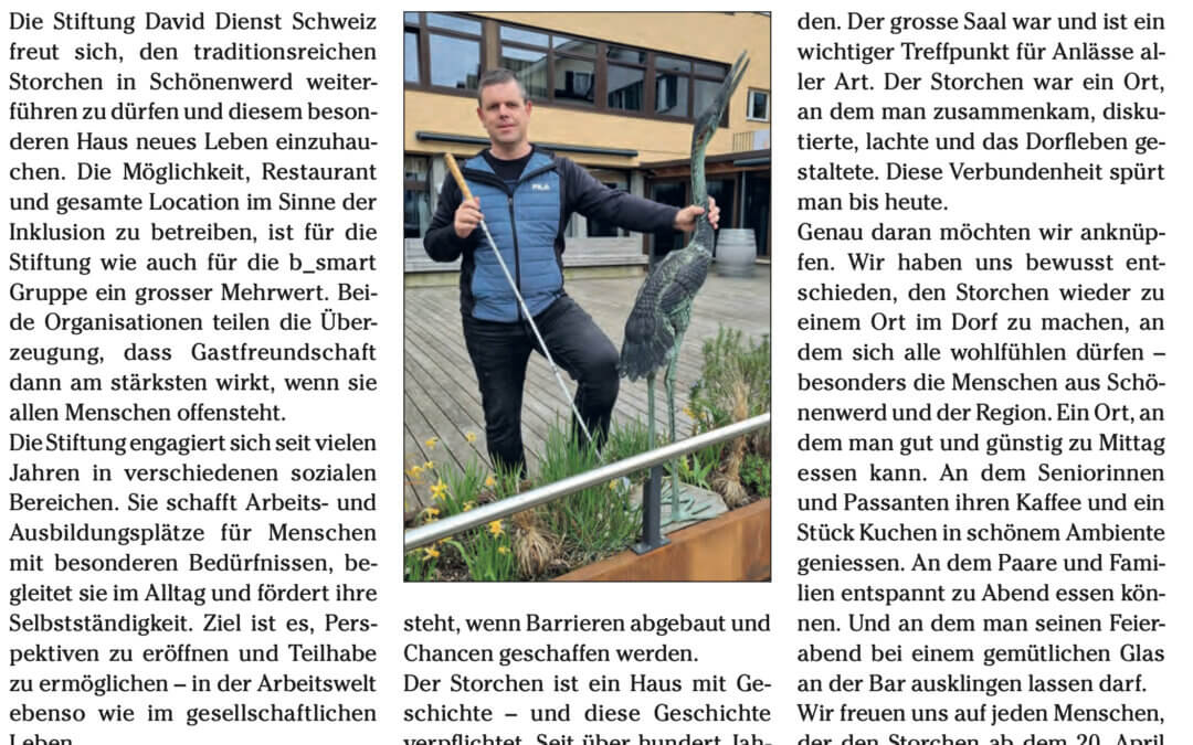 Die Stiftung David Dienst Schweiz freut sich, den traditionsreichen Storchen in Schönenwerd weiterführen zu dürfen und diesem besonderen Haus neues Leben einzuhauchen. Die Möglichkeit, Restaurant und gesamte Location im Sinne der Inklusion zu betreiben, ist für die Stiftung wie auch für die b_smart Gruppe ein grosser Mehrwert. Beide Organisationen teilen die Überzeugung, dass Gastfreundschaft dann am stärksten wirkt, wenn sie allen Menschen offensteht.